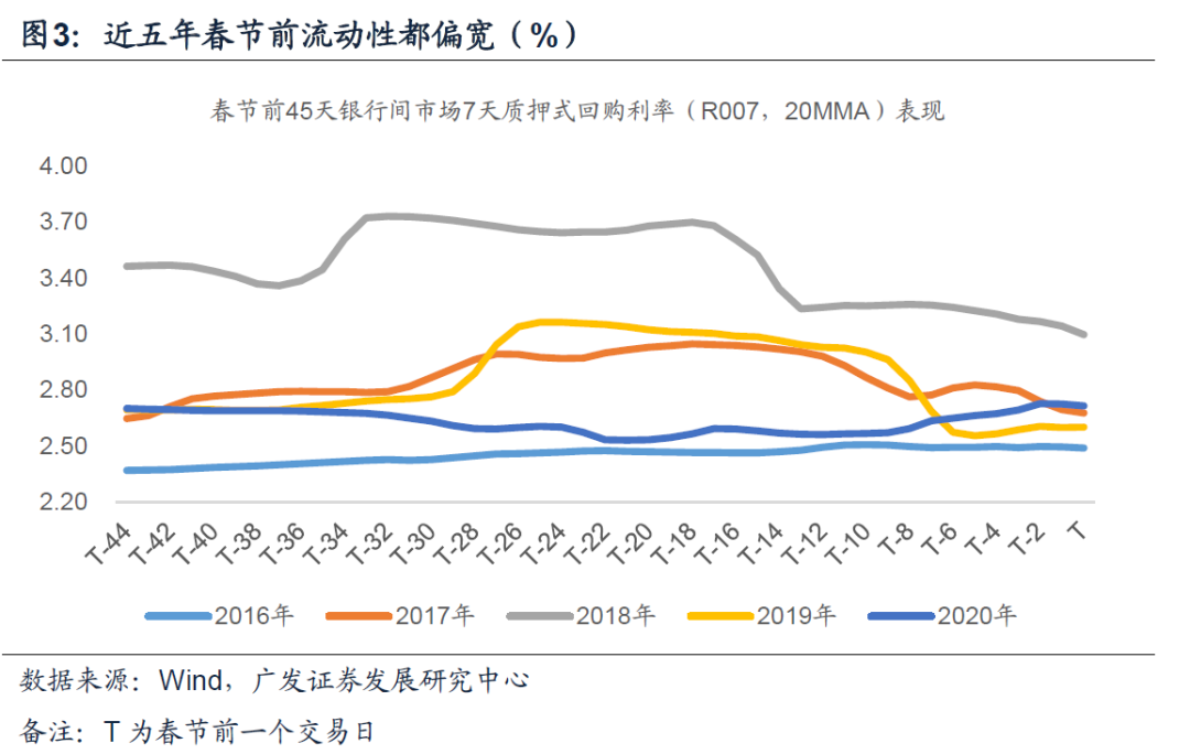 从银行间市场质押式回购利率(R007,20天移动平均)走势来看,春节前银行间市场流动性往往偏松,回购利率趋于下行,即使是在2017年央行货币明显收紧的年份。这意味着春节前央行的操作与资金面的变化,对当年货币政策松紧状况并无太大的指示意义。