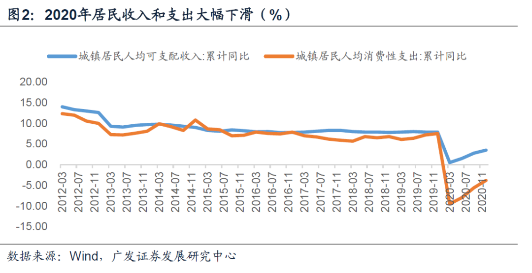 一方面,疫情影响下居民收入增速在2020年出现一定程度下滑,城镇居民收入与支出的累计同比增速在2020年12月分别为3.5%与-3.8%。收入效应影响消费及货币交易性需求。