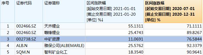 据统计,截至1月20日,纳入申万锂行业的天齐锂业、赣锋锂业和中矿资源,累计涨幅分别为55.13%、25.47%、11.07%。
