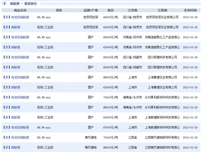据生意社消息,1月19日,来自上海的一家经销商碳酸锂报价上调,其中电池级碳酸锂上调17000元/吨,至80000元/吨。次日,江西、上海两家生产企业分别上调电池级碳酸锂每吨8000元、9000元,至71000元/吨和67000元/吨。