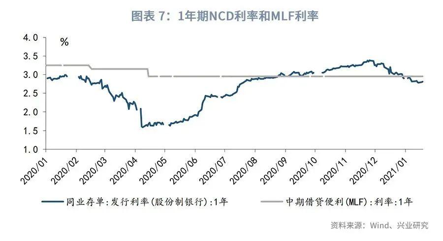 12月份央行表示要“引导市场利率围绕央行政策利率中枢运行”,上述操作进一步确认货币市场利率已经回调到位,进一步下行空间不大。 12月21日央行党委召开会议传达学习中央经济工作会议精神表示,要“引导市场利率围绕央行政策利率中枢运行”,12月份货币市场利率明显回落。从隔夜和7天回购利率的走势来看,随着跨年流动性的逐步到期回笼,当前短端利率已经逐步向7天逆回购水平收敛,1月18日,DR001和DR007已经分别回升至2.14%和2.18%。从1年期NCD利率来看,1月18日,1年期股份制银行NCD发行利率为2.80%,1月份以来,1年期NCD利率已经回落至1年期MLF利率之下。