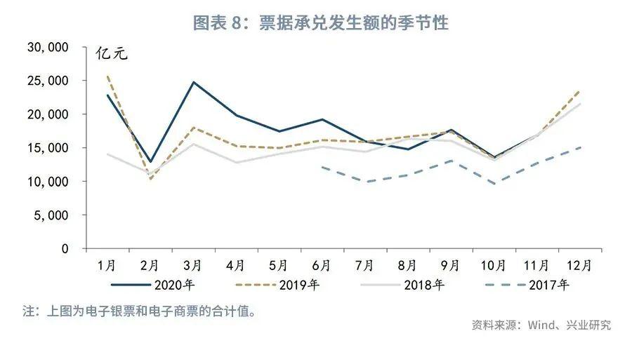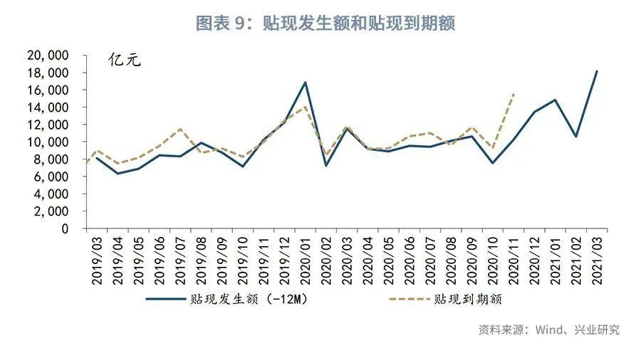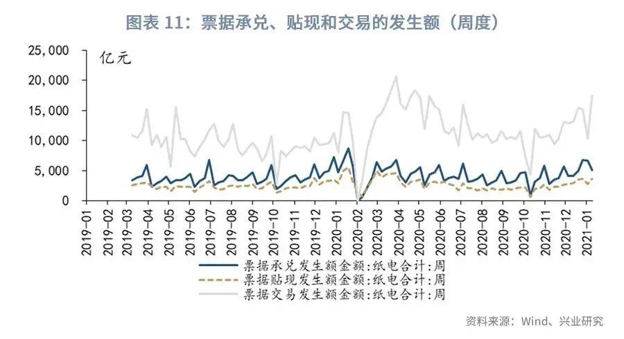从开票量来看,预计1月份和3月份的开票量较大,2月份由于春节假期,开票量会较少。2021年1月上半月数据显示,开票规模略低于上年水平,贴现比例和上年同期基本持平;考虑到2020年3月的开票量较大,由此可能导致2021年3月的票据到期量高于历年同期。