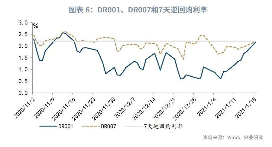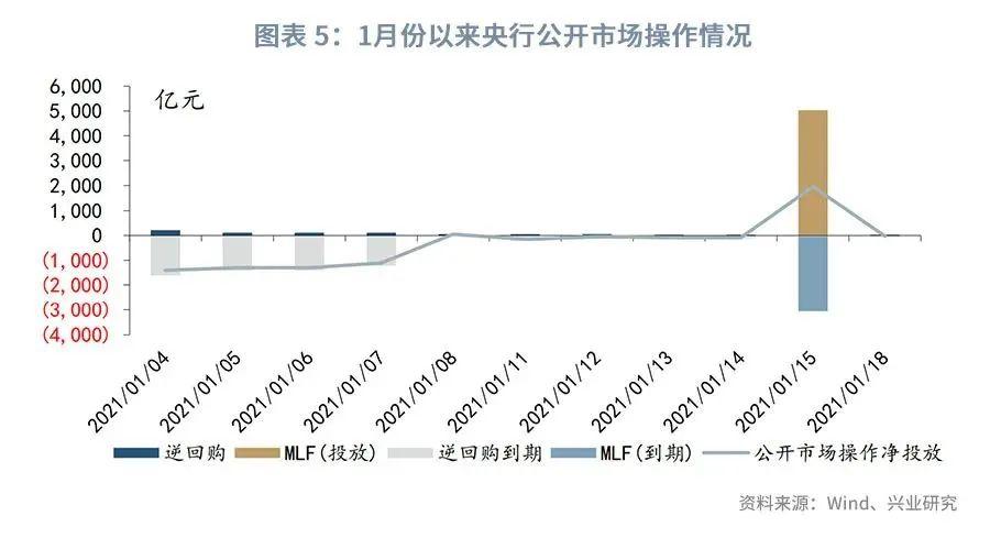 从2021年1月份央行的操作来看, 1月上半月,央行通过罕见的连续多日投放规模在200亿元以下的“迷你”逆回购,且投放规模逐步由200亿元递减至20亿元;1月15日,央行进行5000亿元MLF操作,小幅缩量续作1月份到期的MLF(3000亿元)和TMLF(2405亿元)。上述操作一方面向市场传递维持流动性合理充裕的信号,稳定市场预期;另一方面,逆回购投放量极小且边际递减、MLF小幅缩量,似乎表明央行并不希望流动性进一步宽松。
