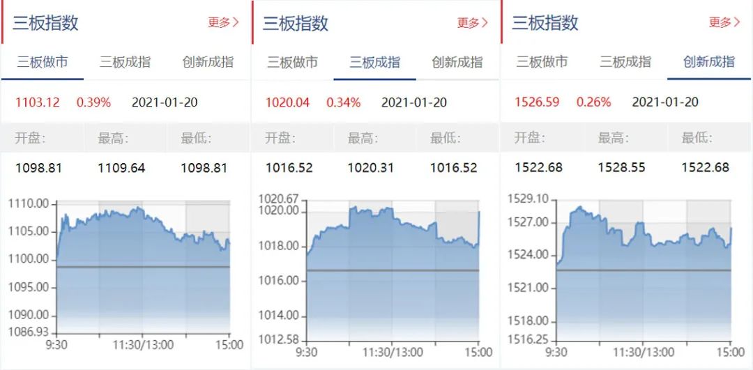 截至1月20日收盘,三板做市报1103.12点,上涨0.39%;三板成指报1020.04点,上涨0.34%;三板创新成指报1526.59点,上涨0.26%。