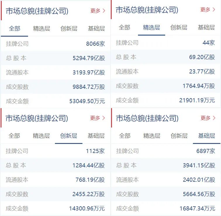 新三板挂牌公司总计8066家(精选层44家,创新层1125家,基础层6897家),总股本5294.79亿股,流通股本3193.97亿股。