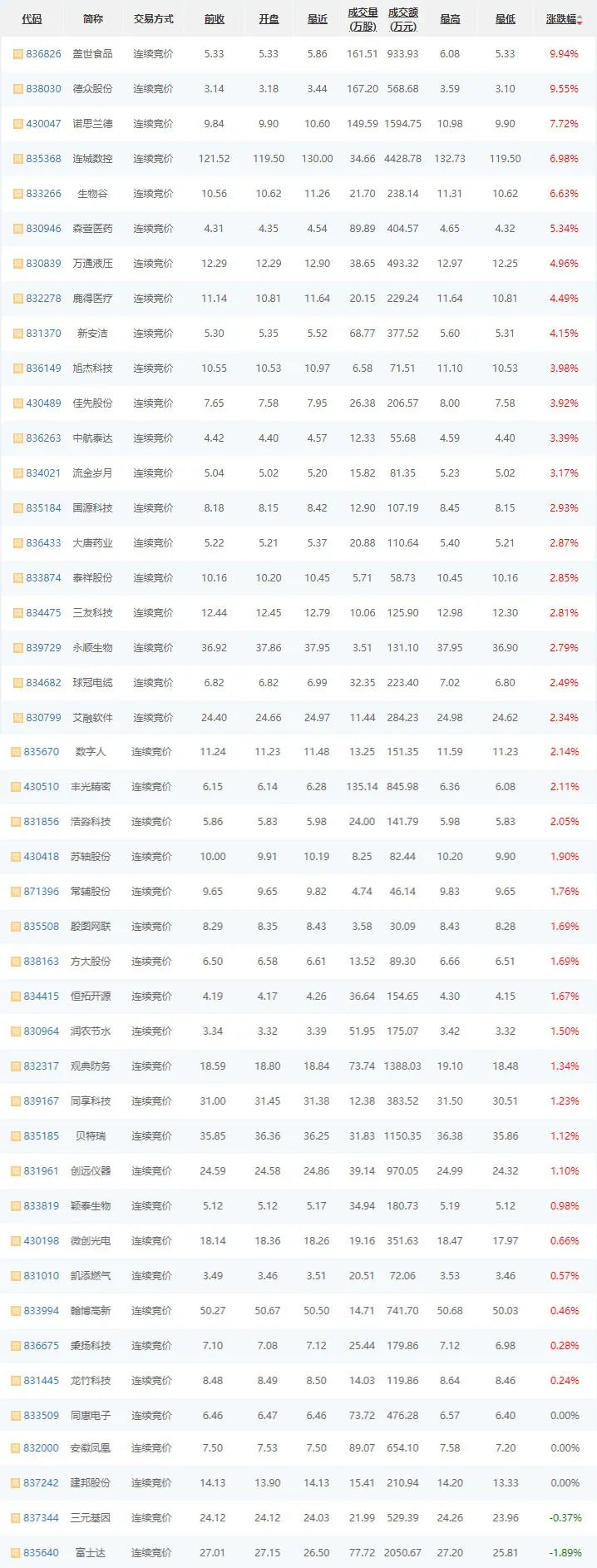 截至1月20日收盘,今日成交金额为5.30亿元,精选层成交金额为2.19亿元,创新层成交金额为1.43元,基础层成交金额为1.68亿元;今日成交股数为9884.72万股,精选层成交股数为1764.94万股,创新层成交股数为2455.22万股,基础层成交股数为5664.56万股。