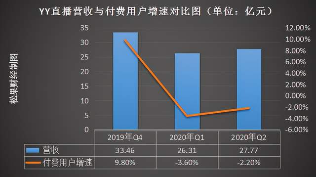 其一,快手、抖音等后浪突袭,YY直播市场地位遭到威胁致使付费用户数与营收的双降。财报数据显示,2019年Q4到2020年Q2,YY直播的付费用户同比增速为9.8%、-3.6%、-2.2%;营收分别为33.46亿元、26.31亿元、27.77亿元。