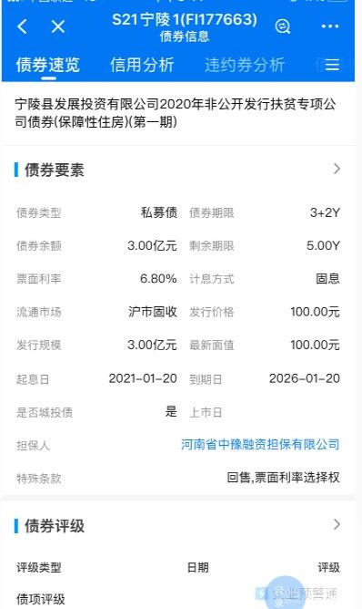企业 预警通显示,宁陵投资此前无主体信用评级且并未发行过债券,此次为首次发行信用债。宁陵投资此次发行的债券品种为用于保障性住房的扶贫专项债券,由河南省中豫融资担保有限公司为本期债券提供不可撤销责任担保。