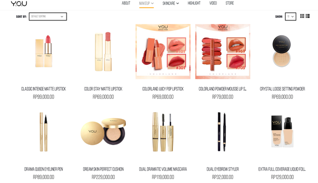 目前,Y.O.U官网共分为美妆和个护两条产品线,产品定价与欧莱雅的开架系列相当,在Shopee上,Y.O.U的产品也取得了不俗的销量,一款定价69,000印尼盾(备注:约32元人民币)的口红已销售了超过1万单。