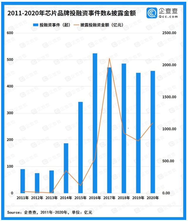 根据企查查大数据研究院发布的《近十年我国芯片半导体品牌投融资报告》,2020年,半导体发生融资事件458起,拿到融资的企业共458家,总金额1097.69亿元。
