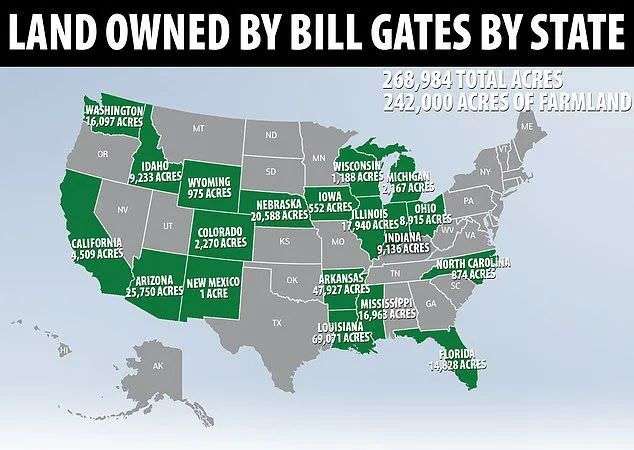 但盖茨并不只是投资农田,他总共在19个州拥有268984英亩的各类土地。