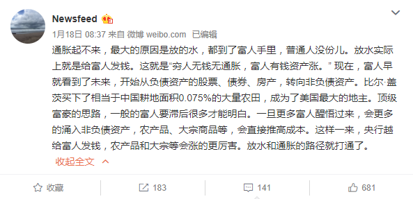 顶级富豪的思路,一般的富人要滞后很多才能明白。一旦更多富人醒悟过来,会更多涌入非负债资产,农产品、大宗商品等,直接推高成本。这样一来,央行越给富人发钱,农产品和大宗等会涨得更厉害,放水和通胀的路径就打通了。”