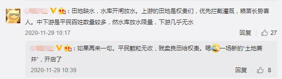理虽是这个理,但也有不少网友感叹:田地缺水,水库开闸放水。上游的田地是权贵们,优先拦截灌溉,粮苗长势喜人。中下游是平民百姓数量较多,然而水库放水限量,下游几乎无水……