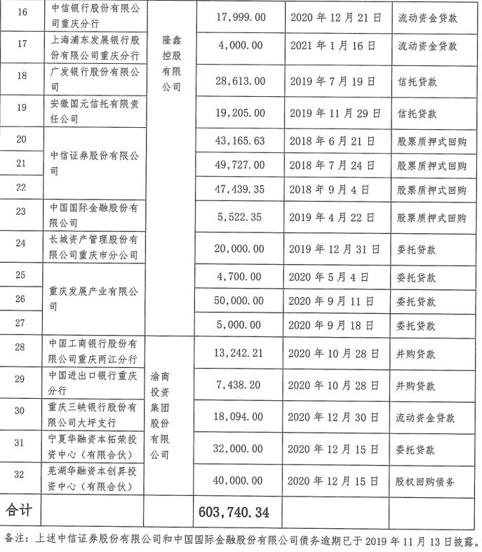 根据公告披露,隆鑫控股逾期债务多达32笔,涉及工行、中行、建行、重庆农商行、广发银行等十余家金融机构,总金额超过60亿元。其中多数已于去年到期。