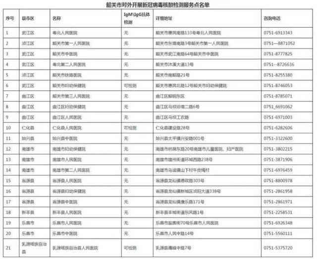 截至2021年1月20日,韶关市共有21家医疗机构对外开展新冠病毒核酸检测服务(其中有3家医疗机构可提供新冠病毒IgMIgG抗体检测服务),对韶关市民(含外地来韶人员)的“愿检尽检”人员,提供新冠病毒核酸采样、检测、出具报告等服务,按照自愿、自费的原则,全面开展核酸检测。