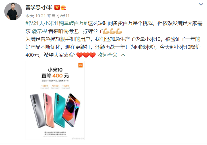 1月22日,小米副总裁曾学忠发文称,为庆祝小米11开售21天销量破百万,小米官宣1月23日0点起,小米10全版本售价降低400,其低配版搭配高通骁龙865处理器起售价仅为3399元。