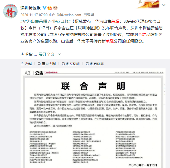 当日,《深圳特区报》发布联合声明,深圳市智信新信息技术有限公司与华为签署了收购协议,完成对荣耀品牌相关业务资产的全面收购,此后华为不再持有新荣耀公司的任何股份。