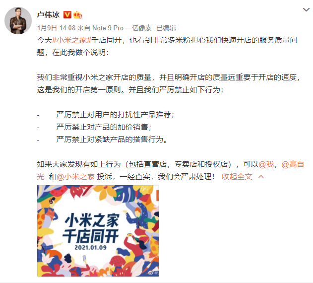 1月4日,小米集团副总裁卢伟冰宣布,小米一周内新增体验店189家;1月9日,小米之家“千店同开”,一天开出了小米过去4年内线下门店的总和。