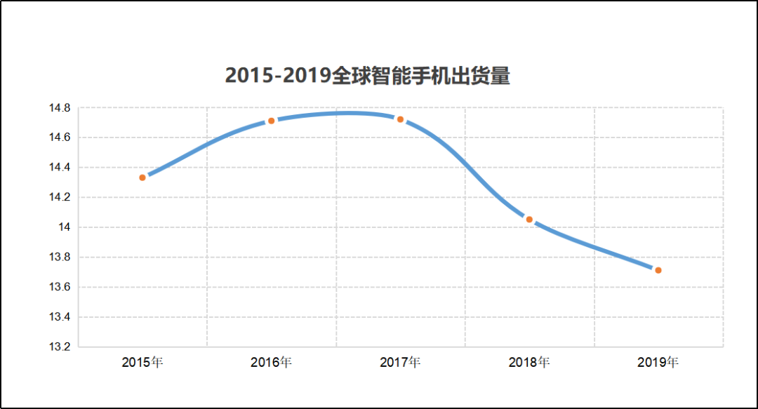 IDC数据显示,近五年来,全球智能手机市场增速不断下滑,2017-2019年,全球智能手机出货量经历三连降,这意味着全球智能手机市场陷入了存量竞争。