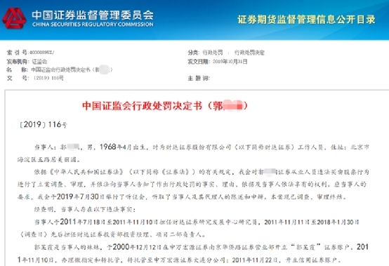 事实上,在郭某到案前的2019年10月,他就因为违规借用胞妹的账户炒股,而收到了来自中国证监会的罚单。