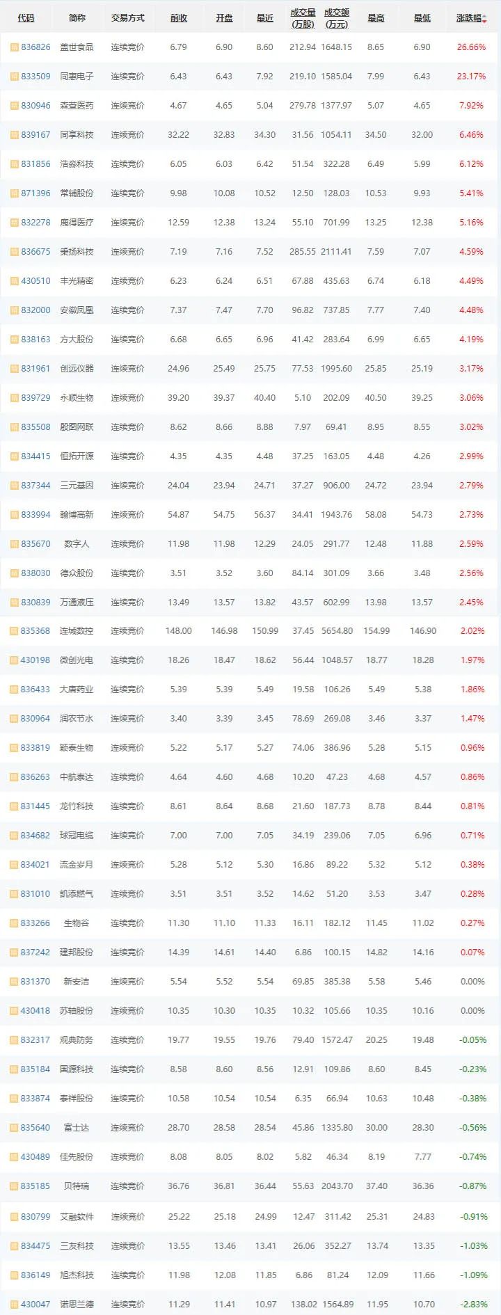 截至1月22日收盘,今日成交金额为6.25亿元,精选层成交金额为3.32亿元,创新层成交金额为1.63元,基础层成交金额为1.31亿元;今日成交股数为10733.44万股,精选层成交股数为2561.68万股,创新层成交股数为2804.82万股,基础层成交股数为5366.94万股。