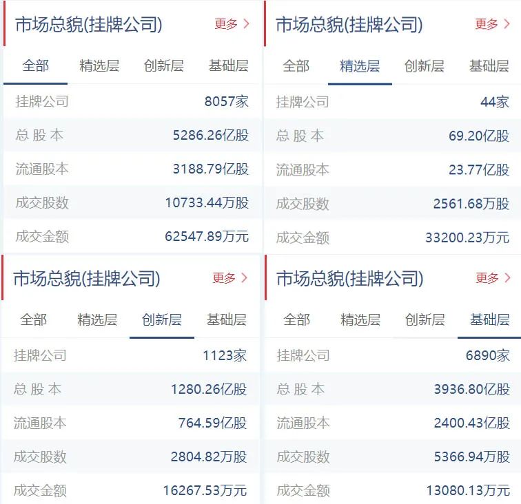 新三板挂牌公司总计8057家(精选层44家,创新层1123家,基础层6890家),总股本5286.26亿股,流通股本3188.79亿股。