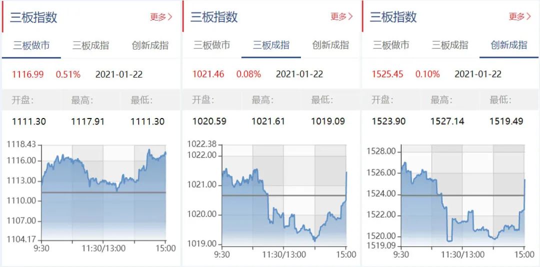 截至1月22日收盘,三板做市报1116.99点,上涨0.51%;三板成指报1021.46点,上涨0.08%;三板创新成指报1525.45点,上涨0.10%。