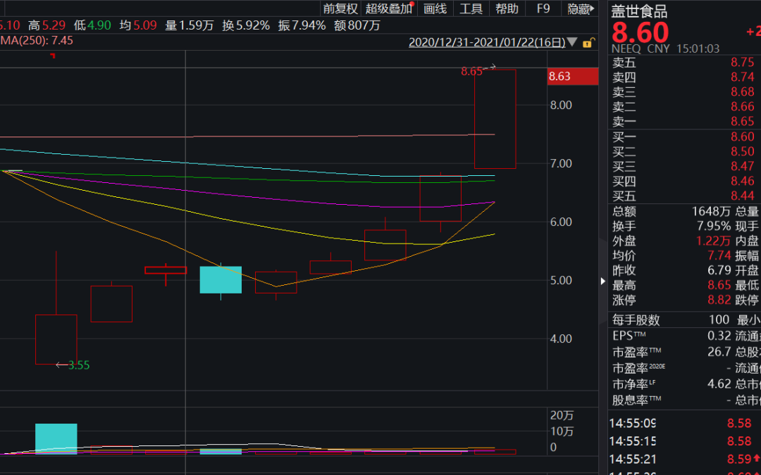 数据显示,盖世食品公开发行价为3.48元/股。挂牌至今,盖世食品区间最高价为8.65元/股,最低价为3.55元每股,区间涨跌幅高达147.13%。