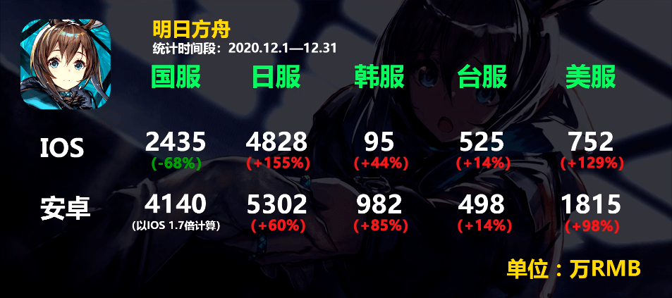 2020年出海榜单的头部固化程度已经非常明显了,进入前10的门槛逐月增高。比如在1月在第15名的《放置少女》,收入超过610万美元;12月同样排在15位的《明日方舟》,海外收入则预估超过1000万美元(当然也与12月是海外市场消费黄金档期有关)。