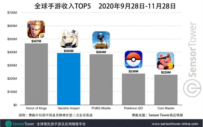 《原神》上市首周在移动端吸金6000万美元,9月28日至11月28日收入3.93亿美元