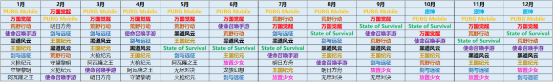 除了另外在全年榜单的前10区间,只有《使命召唤手游》、《龙族幻想》、《明日方舟》以及《原神》等少数几款新游戏,头部市场更多空间还是被老游戏所占领。比如《PUBG Mobile》、《万国觉醒》、《剑与远征》、《荒野行动》、《王国纪元》、《黑道风云》等。