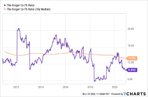对于长期投资者而言, 在准备持有某个股票的时候都会希望一家公司会拥有一个合理的价值, 对于这方面来说, 回顾一份以前10年为一个周期的交易图是评估一只股票的行情的好办法. 所以本文将会基于前十年该股的价格中位数平均数, 计算出一些比率用来比较目前克罗格在经营业绩上的价格位置.