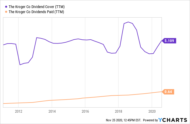 来自盈利的股息覆盖率为5倍,远高于典型的标准普尔500指数公司2-3倍的比例。这意味着Kroger有足够的派息增长空间。如果管理层愿意,派息率可以轻松地翻倍,达到每年每股1.28美元。