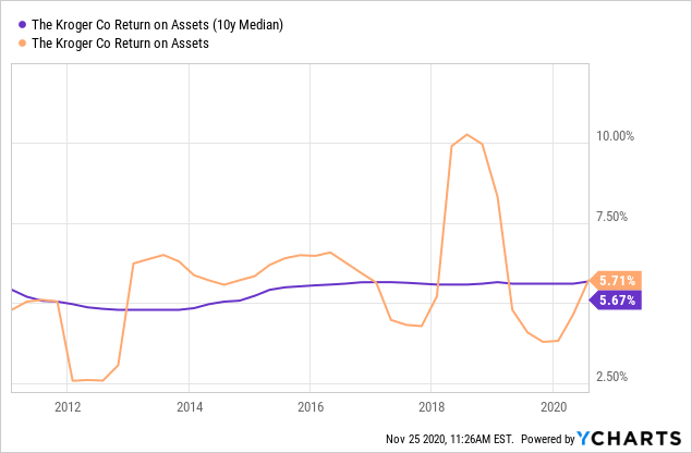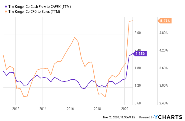与过去十年相比, 现金流已经大幅改善,不管是作为销售额的百分比还是作为资本支出的函数都达到了一个可以说是创纪录的水平。目前克罗格的业务趋势正在往积极方向发展, 对于以高利润率或者回报率为投资目标的投资者来说, 此时是一个非常好的入手时机