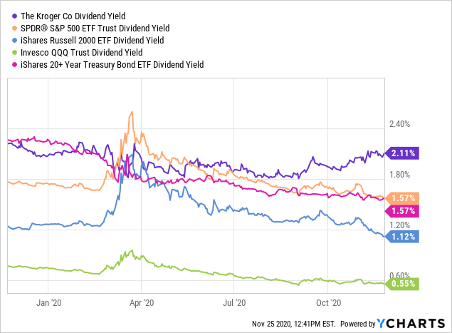而且令人兴奋的是, 不仅它的股息覆盖率一流,而且实际利率远高于其他股票或无风险国债这种替代品。下面是分析师画的1年和10年的图表,对比了SPDR标普500ETF(SPY)、iShares Russell 2000(IWM)小型股、Invesco Nasdaq 100(QQQ)大型科技股和iShares 20+年国债ETF(TLT)的收益率。基本上,相对于这个投资组合来说,今天的克罗格收益率是过去十年来最高的。
