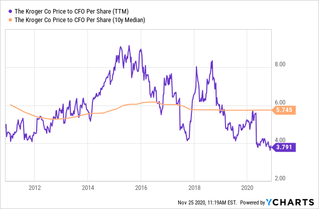 在2020年克罗格股价上涨15%,与五年前该股的报价持平,所有的证据都表明投资者并不完全看好克罗格杂货售卖业务。在投资者把有限使用财务杠杆的因素考虑进去后克罗格以每股32美元的价格蜕变为一个有价值的廉价股。在目前的高现金流率下,克罗格理论上可以在短短四年内偿还所有净债务、IOUs和负债(从总负债中减去流动资产,然后除以经营现金流)。这个比例与典型的标普500指数相比,企业净负债与年化现金流的比例在6倍左右。
