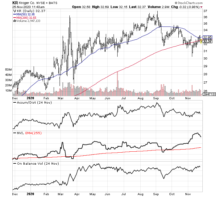 随着2020年11月新冠疫苗研发成功的消息到来, 在很多人都认为克罗格将从此走向衰败的时候, 克罗格的股票没有断崖式下跌反而在缓慢上涨. 由此来看, 克罗格仍然是一个不错的股票, 他们的资产负债情况在不断变好, 且在美国绝大多数地区都占有领先的市场份额. 不管是以按照市场最高定价还是GDP产出还是销售额来分析, 克罗格都是一个目前阶段值得持有的低价股.