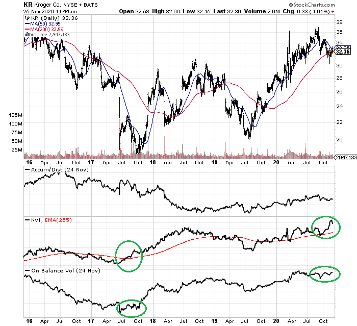 目前来看尽管价格仅有边际上涨,但2020年的技术健康指标是多年来最好的。而且,在9-11月的价格下跌过程中,其动量趋势仍然是积极的。在下面的1年和5年图上,投资者可以回顾今年很好地上升的累积/分布线[ADL]、负量指数[NVI]和平衡量[OBV]情况。上升的趋势线符合交易日内的强劲买盘,以及更多的净资金在上涨日进入股票与在下跌日抛出股票。