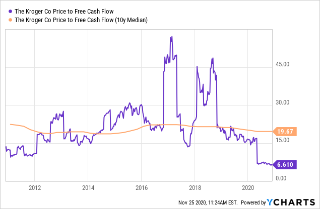 现在现金流和自由现金流的估值价格都处于10年来的新低。所以从逻辑上来说,如果现金流不下降,克罗格的股票便存在巨大上升空间。