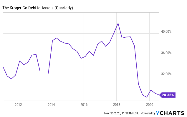 该公司在利用疫情期间所带来的现金创收风潮来偿还债务方面做得非常出色。因为管理层很清楚,现在的这种情况没有办法延续。克罗格聪明地将债务与资产的比例保持在过去十年的最低值,以支撑2021年后的经营业绩。2月至8月间,克罗格减少了30亿美元的净债务(总债务减去现金)。而最有趣的是与此同时,为了在疫情期间业务中断的情况下生存, 美国大多数公司都发行了堆积如山的债务来筹集现金。