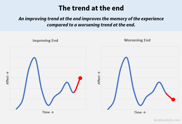 峰值方面,巅峰体验一般是正向的,当然也能见到负向设计(比如利用消费者的“风险规避心理”)。从研究来看,在整个消费者旅程中,要保证至少有一次巅峰体验,给消费者形成深刻的印象;同时,在消费者旅程结束时,“翘尾”的最终体验可以让消费者体验曲线出现再一次上扬,就能让这次旅程在消费者心中形成长久的记忆。