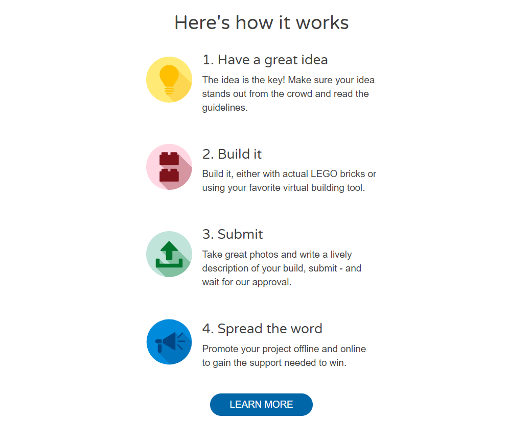 乐高在这里做的就是搭建一个平台,让乐高迷可以发挥才智,创造新品,而且一个设计只要能在乐高的线上社区获得10,000张支持票,就可能会成为真正的乐高产品。