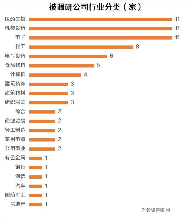 从行业分布来看,电子、机械设备、医药生物最受机构青睐,均有11家相关公司被调研,其次是化工、电气设备行业,均有5家以上公司获调研。