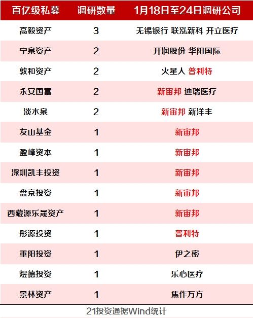 从具体调研机构来看,高毅资产、敦和资产、重阳投资、景林资产等14家百亿知名私募调研了13家公司。其中,高毅资产最为积极,调研了无锡银行(600908.SH)等3家公司。永安国富、淡水泉、盈峰资本等7家百亿私募调研了新宙邦,普利特(002324.SZ)也获敦和资产、彤源投资共同调研。