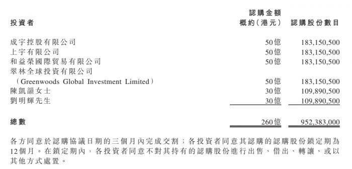 同时益荣国际贸易有限公司和翠林全球投资有限公司各自出资50亿港元,前者实控人为王开国,专注大宗贸易及私募股权和公开市场投资,后者实控人为翠林集团董事长王忠明,该集团成立于1993年,资产总额达500亿元。