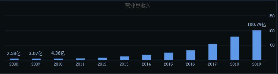 最能反映科技企业产品商业化成绩的是营业收入。2008年上市以来,科大讯飞营收从2.58亿增至2019年的100.79亿,11年增长近40倍,年化增速超过40%。