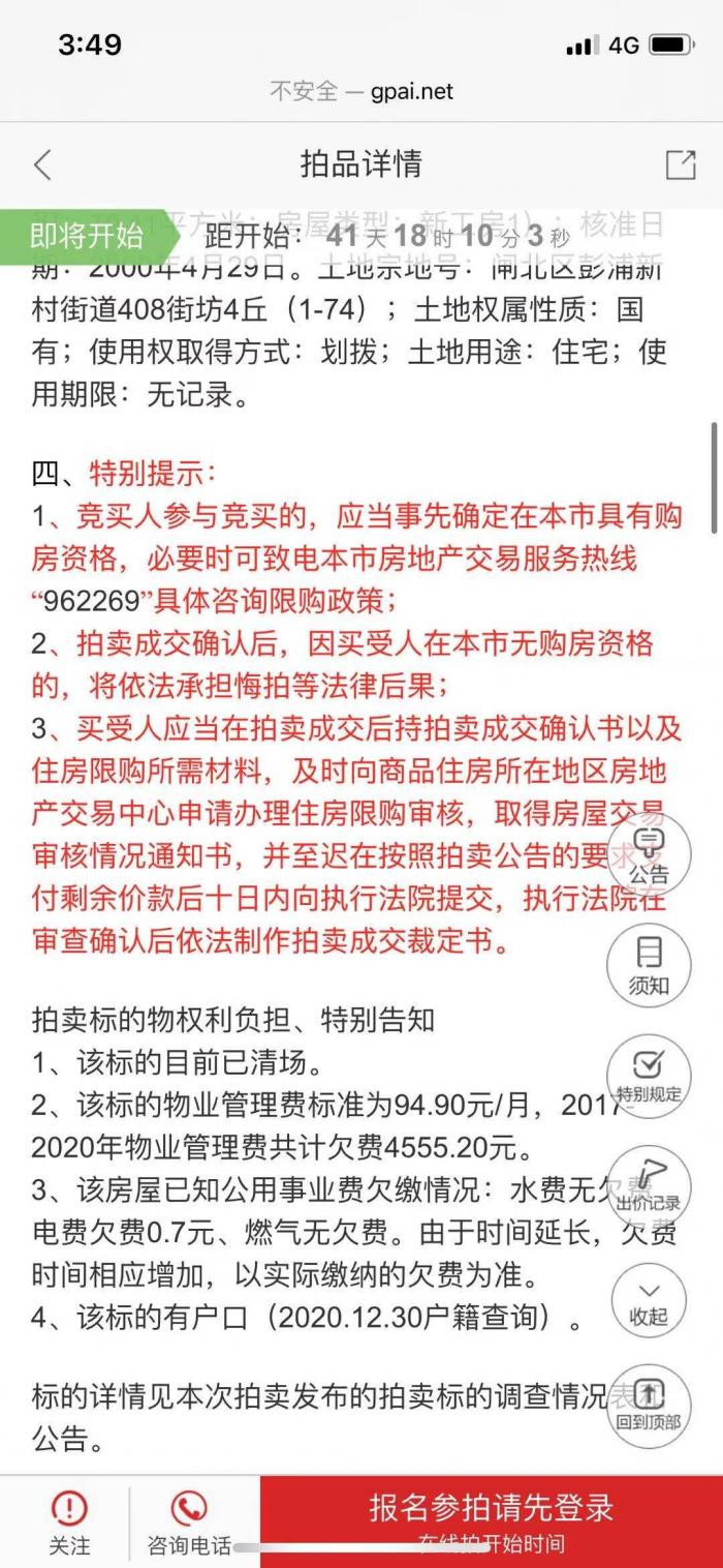 记者查询了公拍网的相关拍卖房信息发现,出现了标红提醒:“竞买人参与竞买的,应当事先确定在本市具有购房资格,必要时可致电本市房地产交易服务热线具体咨询限购政策”,并提醒:“拍卖成交确认后,因买受人在本市无购房资格的,将依法承担悔拍等法律后果。”