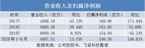从招股书最新的数据来看,2020年1-9月,公司实现营收48.88亿元,同比增长13.53%,归属净利润为2.4亿元,同比增长146.61%,净利润大幅增长,主要因为毛利率增长。