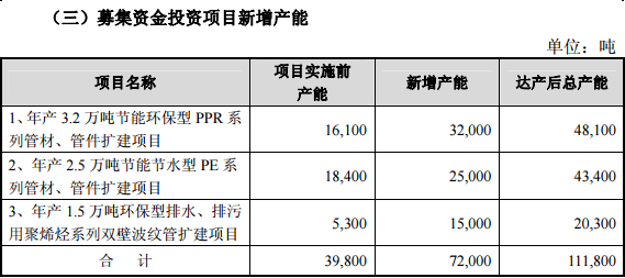按照伟星新材的招股说明募集资金用途,主要为管材、管件的项目的建设,最大的产能投入为PPR管项目建设,占比将近60%。