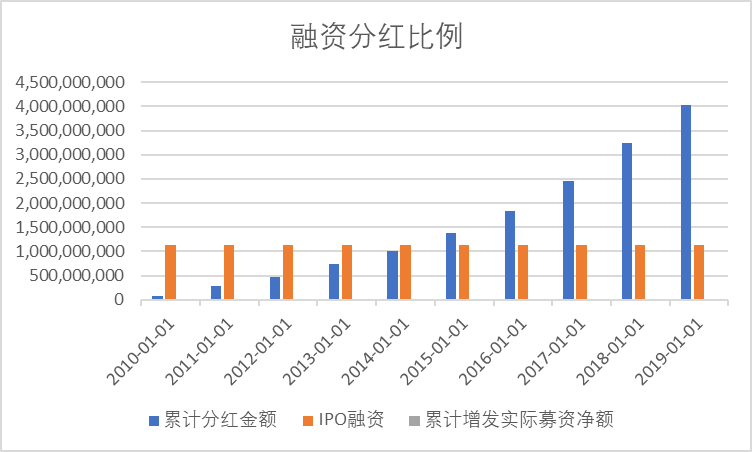 伟星新材2010年上市以来,保持每年稳定分红,股息率平均为3.3%,累积分红超过40亿元,但是没有进行过任何增发融资,除了上市IPO 11.4亿元。
